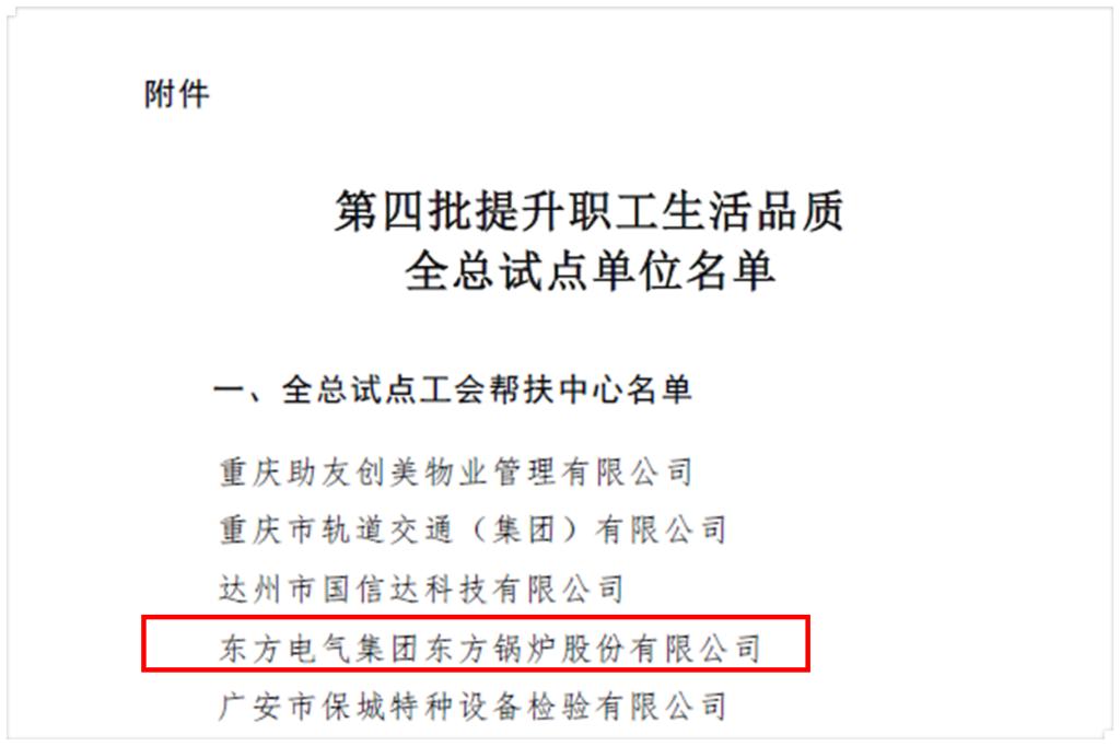 东方锅炉入选第四批提升职工生活品质全国总工会试点单位